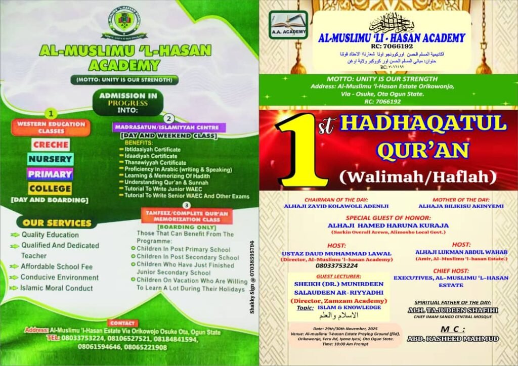 It is official, we the residents of the above estate cordially invite the general public to our two-days program to celebrate the graduation of our children from the madrasah from one level to another, mark the completion of Quranic memorization from our Tahfeez school as well as launch our Central Mosque. The programs are to hold at the Estate Eid ground, with the Hadhaqatul’Quran on Saturday 29th November, 2025 by 10:00 a.m and the Haflatul Quran/launching of the central mosque on Sunday 30th November, 2025 by 10:00 a.m. May Allah spare our lives to witness both occasions and grant us the goodness from them. Aamin.